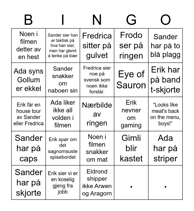 This bingo card has 34 words: ., ., ., ., Sander har på caps, Sander snakker om naboen sin, Sander har på to blå plagg, Sander har på skjorte, Sander sier han er taktisk på hva han sier, men har glemt å tenke på klær, Sander sier han er taktisk på hva han sier, men har glemt å tenke på klær, Fredrica sier noe på svensk som noen ikke forstår., Fredrica sitter på gulvet, Fredrica grøsser av Gollum, Fredrica viser tegn på at hun egentlig er litt lei av ringenes herre, Erik nevner om gaming, Erik har på band t-skjorte, Erik sier vi er en koselig gjeng fra jobb, Erik får en house tour av Sander eller Fredrica, Erik spør om det sagnomsuste spisebordet, Gimli blir kastet, Noen i filmen snakker om mat, Noen i filmen blir minnet på sitt eget navn, Noen i filmen detter av en hest, “Looks like meat's back on the menu, boys!”, Eldrond shipper ikke Arwen og Aragorn, Nærbilde av ringen, Frodo ser på ringen, Gollum spiser mat, Eye of Sauron, Ada syns Gollum er ekkel, Ada syns noe i filmen er skummel, Ada liker ikke all volden i filmen, Ada har på striper and Ada tilbyr seg å sitte på gulvet.