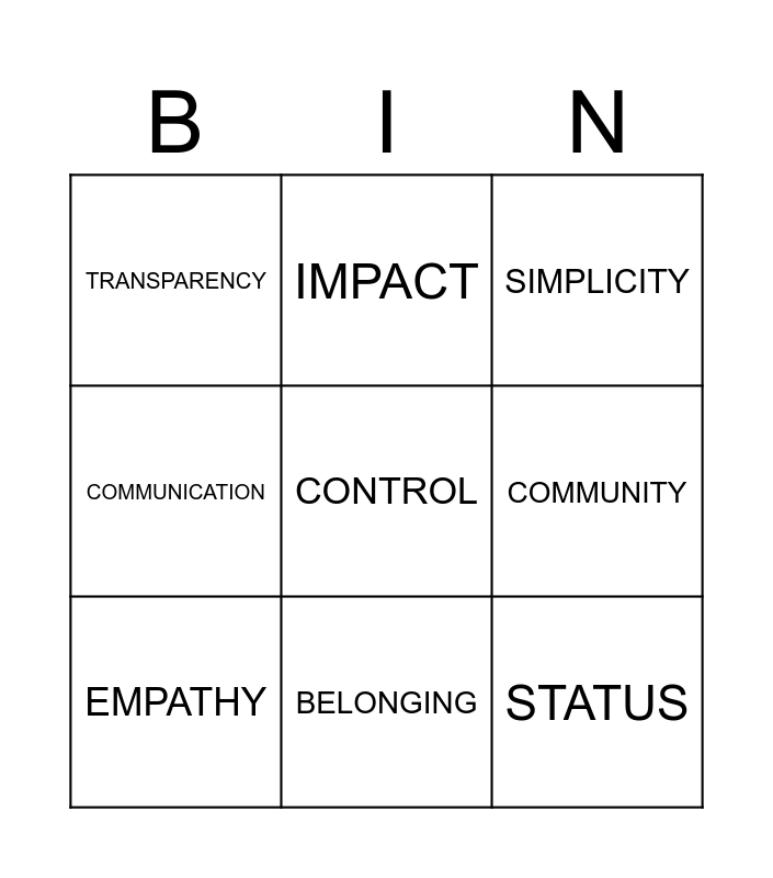 This bingo card has a free space and 11 words: EASE, BELONGING, STATUS, EMPATHY, IMPACT, SIMPLICITY, COMMUNITY, UNIQUE, COMMUNICATION, TRANSPARENCY and KINDNESS.