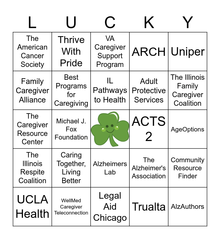 This bingo card has a free space and 26 words: Alzheimers Lab, Trualta, IL Pathways to Health, WellMed Caregiver Teleconnection, Uniper, The American Cancer Society, Family Caregiver Alliance, Thrive With Pride, AgeOptions, The Alzheimer's Association, Adult Protective Services, The Caregiver Resource Center, Community Resource Finder, UCLA Health, Michael J. Fox Foundation, The Parkinson's Foundation, ARCH, The Illinois Respite Coalition, VA Caregiver Support Program, AlzAuthors, The Illinois Family Caregiver Coalition, Legal Aid Chicago, ACTS 2, Caring Together, Living Better, Best Programs for Caregiving and CHOPE.