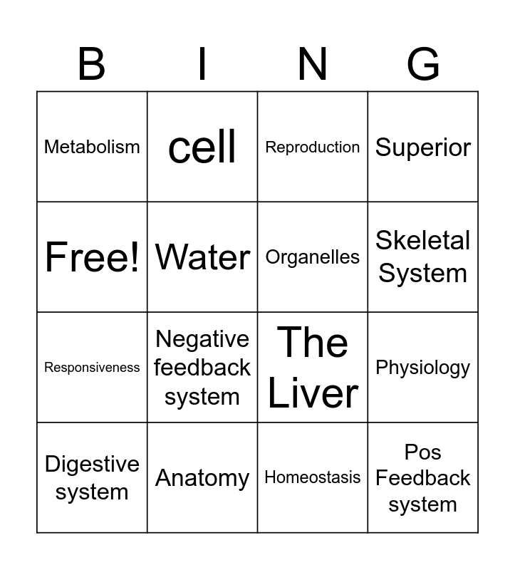 This bingo card has 16 words: Anatomy, Physiology, Reproduction, Metabolism, Responsiveness, cell, The Liver, Homeostasis, Free!, Water, Digestive system, Superior, Negative feedback system, Skeletal System, Organelles and Pos Feedback system.