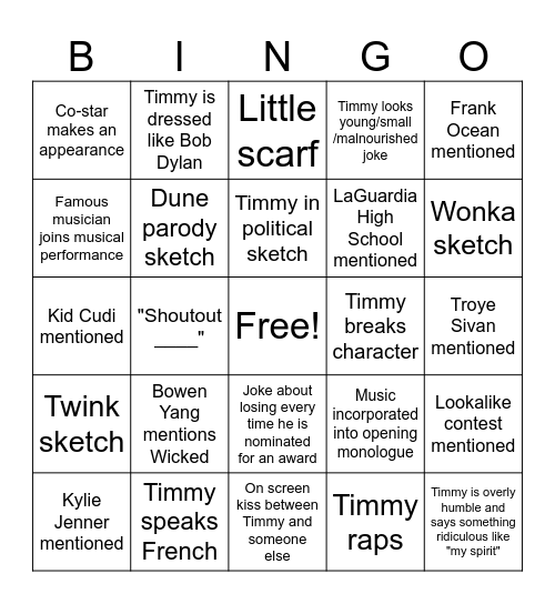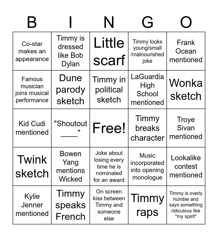 This bingo card has a free space and 29 words: Kylie Jenner mentioned, Timmy takes his shirt off, "Shoutout ____", Statistics mentioned, Co-star makes an appearance, Little scarf, Dune parody sketch, Bowen Yang mentions Wicked, Timmy breaks character, Timmy speaks French, Troye Sivan mentioned, Timmy is overly humble and says something ridiculous like "my spirit", On screen kiss between Timmy and someone else, Timmy raps, Wonka sketch, Nicki Minaj mentioned, Joke about losing every time he is nominated for an award, Twink sketch, Frank Ocean mentioned, Kid Cudi mentioned, Music incorporated into opening monologue, Brat sketch, LaGuardia High School mentioned, Famous musician joins musical performance, Timmy looks young/small /malnourished joke, Timmy is dressed like Bob Dylan, Lookalike contest mentioned, Timmy in political sketch and Club Chalamet mentioned.