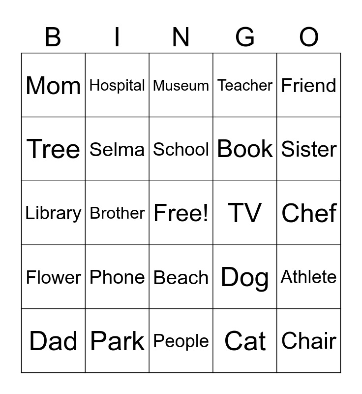 This bingo card has a free space and 24 words: Phone, Park, School, Dad, Friend, Mom, Tree, Hospital, TV, Beach, Book, Library, Dog, Athlete, Selma, Cat, Chef, Museum, Sister, Brother, Chair, Flower, Teacher and People.
