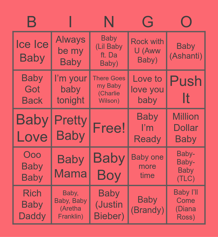 This bingo card has a free space and 25 words: Baby Mama, Baby (Justin Bieber), There Goes my Baby (Charlie Wilson), Rich Baby Daddy, Baby (Ashanti), Ice Ice Baby, Baby Got Back, Always be my Baby, Baby I’m Ready, Baby Boy, Love to love you baby, Baby Love, Baby one more time, Baby-Baby-Baby (TLC), I’m your baby tonight, Money Baby, Million Dollar Baby, Baby (Lil Baby ft. Da Baby), Push It, Pretty Baby, Baby I’ll Come (Diana Ross), Baby, Baby, Baby (Aretha Franklin), Ooo Baby Baby, Rock with U (Aww Baby) and Baby (Brandy).
