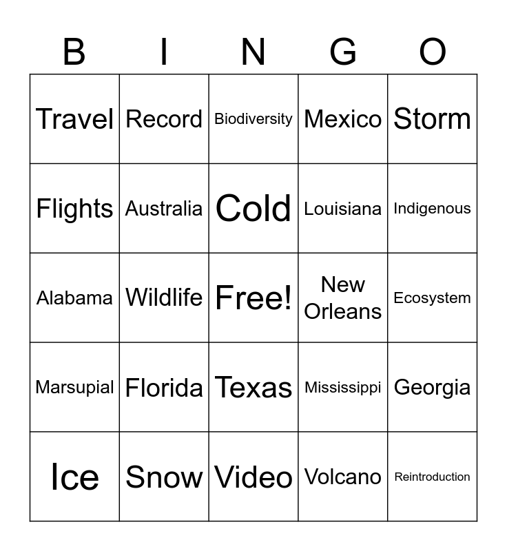 This bingo card has a free space and 24 words: Florida, Snow, Cold, Ice, Storm, Travel, Flights, Record, New Orleans, Texas, Louisiana, Alabama, Mississippi, Georgia, Australia, Volcano, Ecosystem, Biodiversity, Indigenous, Wildlife, Reintroduction, Marsupial, Mexico and Video.