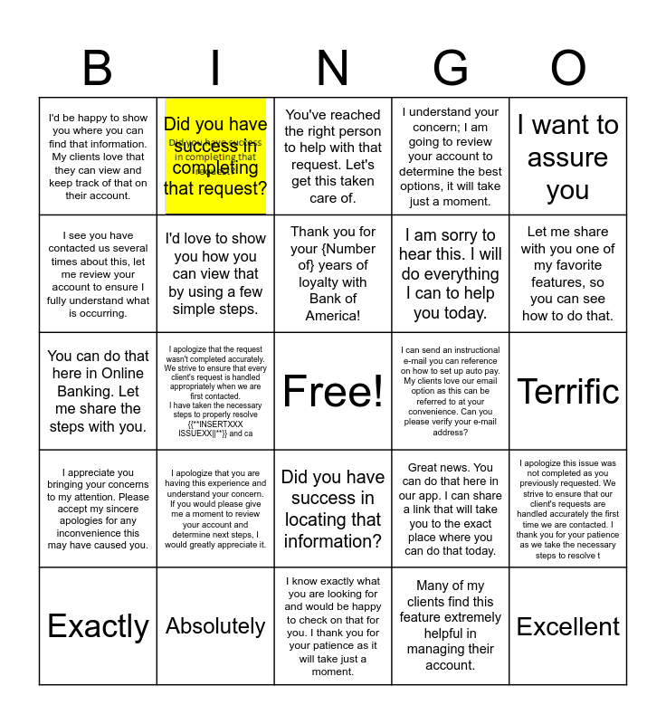This bingo card has 1 images, a free space and 24 words: I apologize that you are having this experience and understand your concern. If you would please give me a moment to review your account and determine next steps, I would greatly appreciate it., Absolutely, Thank you for your {Number of} years of loyalty with Bank of America!, Exactly, I want to assure you, I'd be happy to show you where you can find that information. My clients love that they can view and keep track of that on their account., I see you have contacted us several times about this, let me review your account to ensure I fully understand what is occurring., Did you have success in completing that request?, I can send an instructional e-mail you can reference on how to set up auto pay. My clients love our email option as this can be referred to at your convenience. Can you please verify your e-mail address?, Did you have success in locating that information?, I am sorry to hear this. I will do everything I can to help you today., You can do that here in Online Banking. Let me share the steps with you., Great news. You can do that here in our app. I can share a link that will take you to the exact place where you can do that today., I apologize this issue was not completed as you previously requested. We strive to ensure that our client's requests are handled accurately the first time we are contacted. I thank you for your patience as we take the necessary steps to resolve t, I'd love to show you how you can view that by using a few simple steps., Many of my clients find this feature extremely helpful in managing their account., Terrific, You've reached the right person to help with that request. Let's get this taken care of., Let me share with you one of my favorite features, so you can see how to do that., I apologize that the request wasn't completed accurately. We strive to ensure that every client's request is handled appropriately when we are first contacted. I have taken the necessary steps to properly resolve {{**INSERTXXX ISSUEXX||**}} and ca, Excellent, I appreciate you bringing your concerns to my attention. Please accept my sincere apologies for any inconvenience this may have caused you., I understand your concern; I am going to review your account to determine the best options, it will take just a moment. and I know exactly what you are looking for and would be happy to check on that for you. I thank you for your patience as it will take just a moment..