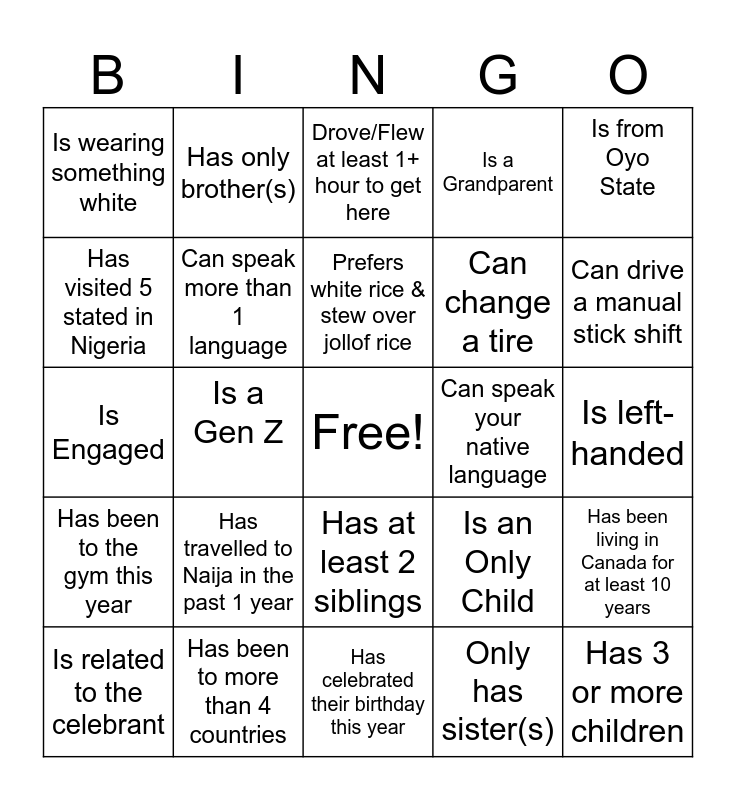 This bingo card has a free space and 24 words: Has travelled to Naija in the past 1 year, Has been to more than 4 countries, Prefers white rice & stew over jollof rice, Is related to the celebrant, Is from Oyo State, Is wearing something white, Has visited 5 stated in Nigeria, Has only brother(s), Can speak your native language, Has at least 2 siblings, Can change a tire, Is Engaged, Is an Only Child, Has been living in Canada for at least 10 years, Can speak more than 1 language, Only has sister(s), Is left-handed, Drove/Flew at least 1+ hour to get here, Can drive a manual stick shift, Is a Gen Z, Has 3 or more children, Has been to the gym this year, Is a Grandparent and Has celebrated their birthday this year.
