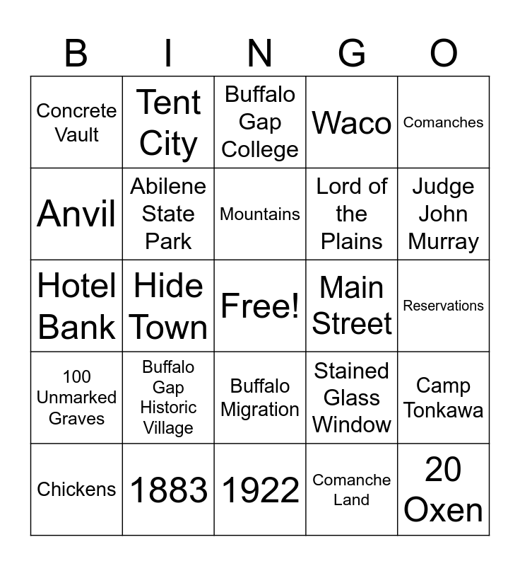 This bingo card has a free space and 38 words: Buffalo Hunters, Quiet Town, Abilene, Abilene State Park, Camp Tonkawa, Buffalo Gap Historic Village, Mountains, Santa Fe Railroad, Comanches, Lord of the Plains, Hide Town, Waco, 20 Oxen, Reservations, Anvil, 100 Unmarked Graves, Chapel, Buffalo Gap College, Governor of Arizona, Main Street, Concrete Vault, 1883, Judge John Murray, Chickens, Live Oak Trees, 1922, $15 a Month, Beautiful Buffalo Gap, County Seat, Early Indians, Presbyterian Encampment, Buffalo Migration, Comanche Land, Tent City, Oldest Cemetery in Taylor County, Stained Glass Window, Hotel Bank and Depot.