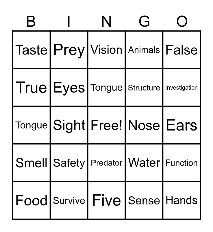 This bingo card has a free space and 29 words: Environment, Survive, Vision, Touch, False, Taste, Eyes, Tongue, Nose, Function, Food, Sight, Sense, Hands, Tongue, Observe, Five, Water, Investigation, Smell, Safety, Hear, Structure, Ears, True, Prey, Predator, Animals and Information.