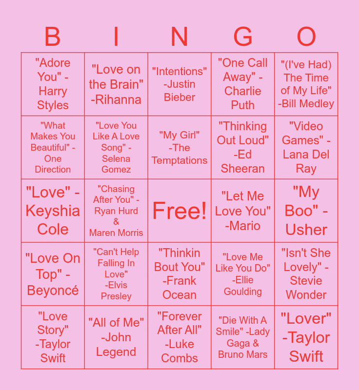 This bingo card has a free space and 24 words: "Can't Help Falling In Love" -Elvis Presley, "All of Me" -John Legend, "My Girl" -The Temptations, "Love Story" -Taylor Swift, "(I've Had) The Time of My Life" -Bill Medley, "Adore You" -Harry Styles, "What Makes You Beautiful" -One Direction, "Love on the Brain" -Rihanna, "Let Me Love You" -Mario, "Thinkin Bout You" -Frank Ocean, "Thinking Out Loud" -Ed Sheeran, "Love" -Keyshia Cole, "Love Me Like You Do" -Ellie Goulding, "Isn't She Lovely" -Stevie Wonder, "Love You Like A Love Song" -Selena Gomez, "Die With A Smile" -Lady Gaga & Bruno Mars, "My Boo" -Usher, "Intentions" -Justin Bieber, "Video Games" -Lana Del Ray, "Chasing After You" -Ryan Hurd & Maren Morris, "Lover" -Taylor Swift, "Love On Top" -Beyoncé, "One Call Away" -Charlie Puth and "Forever After All" -Luke Combs.