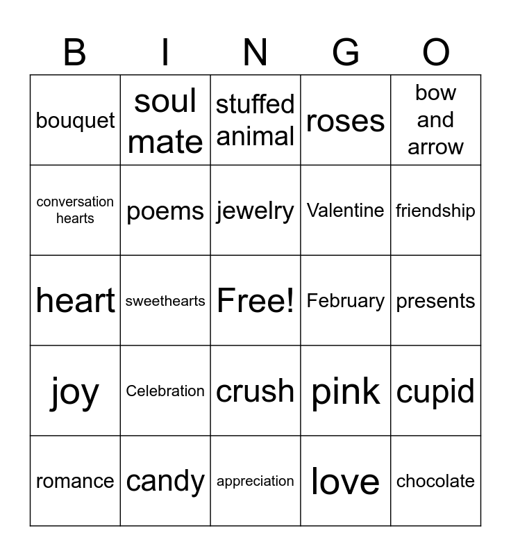 This bingo card has a free space and 25 words: Celebration, appreciation, jewelry, romance, bow and arrow, bouquet, conversation hearts, soul mate, February, crush, Valentine, heart, pink, cupid, poems, cards, presents, stuffed animal, friendship, sweethearts, chocolate, candy, joy, roses and love.
