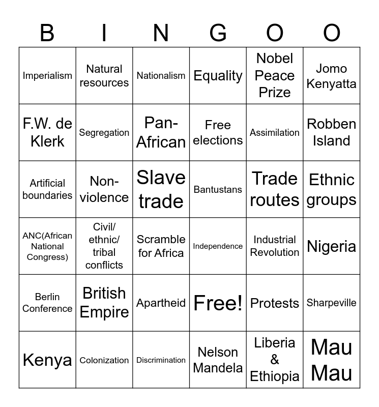 This bingo card has 36 words: Free!, Apartheid, Nelson Mandela, F.W. de Klerk, ANC(African National Congress), Bantustans, Segregation, Discrimination, Nobel Peace Prize, Protests, Robben Island, Equality, Sharpeville, Non-violence, Free elections, Imperialism, Berlin Conference, Trade routes, Artificial boundaries, Nationalism, Slave trade, Civil/ ethnic/ tribal conflicts, Independence, Scramble for Africa, Industrial Revolution, Natural resources, Assimilation, Colonization, Pan-African, Jomo Kenyatta, Mau Mau, Kenya, Nigeria, Ethnic groups, British Empire and Liberia & Ethiopia.