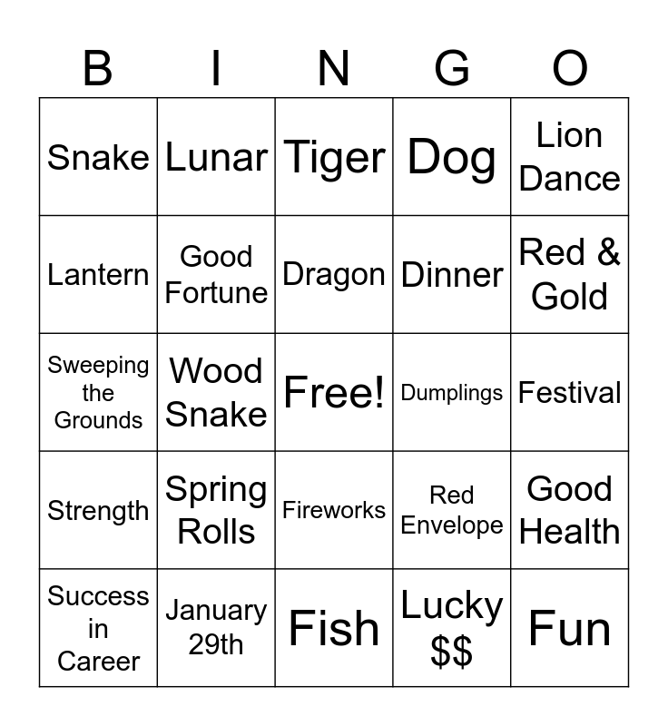 This bingo card has a free space and 26 words: Fireworks, Lucky $$, Dragon, January 29th, Lion Dance, Snake, Lantern, Lunar, Festival, Red Envelope, Dinner, Sweeping the Grounds, Good Health, Success in Career, Wood Snake, Pig, Dog, Strength, Tiger, Fun, Red & Gold, Fish, Dumplings, Spring Rolls, Good Fortune and Nian Gao.