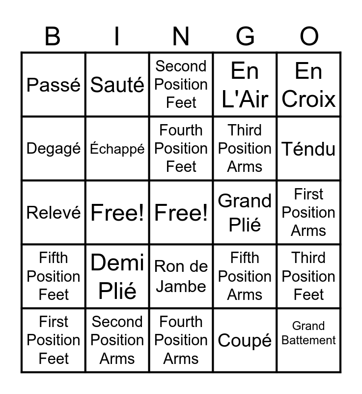 This bingo card has a free space and 24 words: First Position Feet, Demi Plié, Fourth Position Feet, Coupé, En Croix, Passé, Sauté, Second Position Feet, Grand Plié, First Position Arms, Relevé, Échappé, Fifth Position Arms, Third Position Feet, Degagé, Second Position Arms, Fourth Position Arms, En L'Air, Téndu, Fifth Position Feet, Free!, Ron de Jambe, Third Position Arms and Grand Battement.
