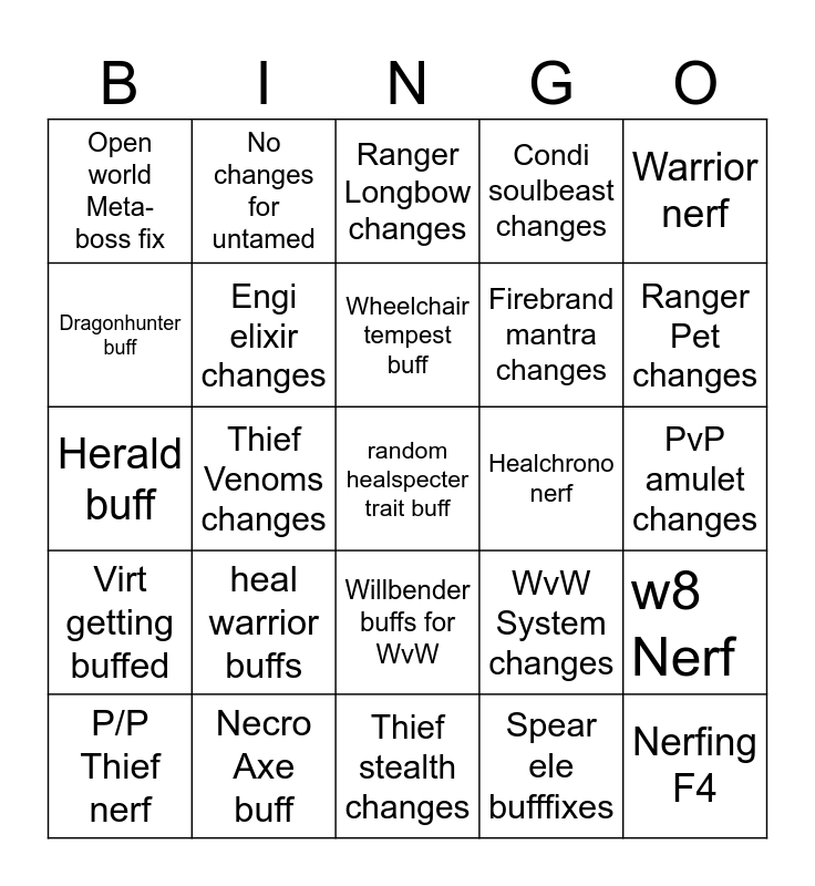 This bingo card has 25 words: Virt getting buffed, Necro Axe buff, random healspecter trait buff, Spear ele bufffixes, Warrior nerf, Open world Meta-boss fix, No changes for untamed, Ranger Longbow changes, Healchrono nerf, w8 Nerf, Dragonhunter buff, Engi elixir changes, Thief stealth changes, WvW System changes, Ranger Pet changes, P/P Thief nerf, Thief Venoms changes, Wheelchair tempest buff, Firebrand mantra changes, PvP amulet changes, Herald buff, heal warrior buffs, Willbender buffs for WvW, Condi soulbeast changes and Nerfing F4.