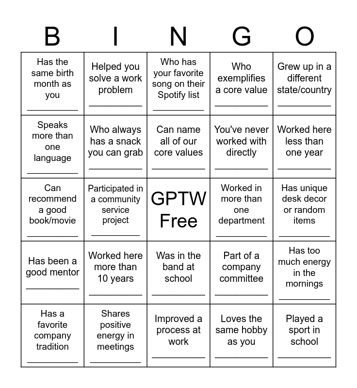 This bingo card has a free space and 24 words: Worked here more than 10 years __________, Shares positive energy in meetings __________, Can name all of our core values __________, Has a favorite company tradition __________, Grew up in a different state/country __________, Has the same birth month as you __________, Speaks more than one language __________, Helped you solve a work problem __________, Worked in more than one department __________, Was in the band at school __________, You've never worked with directly __________, Can recommend a good book/movie __________, Part of a company committee __________, Has too much energy in the mornings __________, Who always has a snack you can grab __________, Loves the same hobby as you __________, Has unique desk decor or random items __________, Who has your favorite song on their Spotify list __________, Worked here less than one year __________, Participated in a community service project __________, Played a sport in school __________, Has been a good mentor __________, Who exemplifies a core value __________ and Improved a process at work __________.