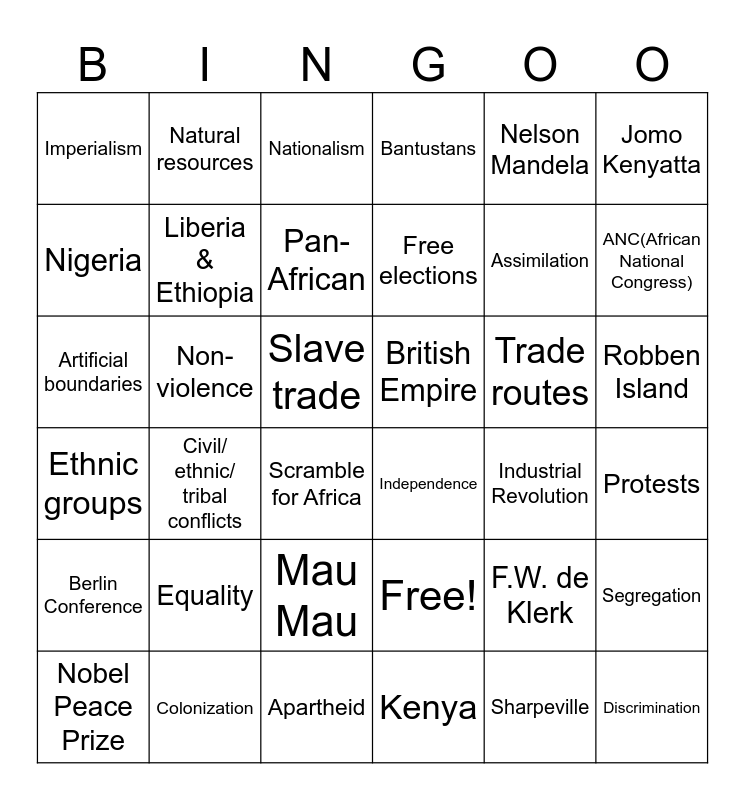 This bingo card has 36 words: Free!, Mau Mau, Kenya, Nigeria, Ethnic groups, British Empire, Liberia & Ethiopia, Apartheid, Nelson Mandela, F.W. de Klerk, ANC(African National Congress), Bantustans, Segregation, Non-violence, Free elections, Imperialism, Berlin Conference, Trade routes, Artificial boundaries, Nationalism, Slave trade, Civil/ ethnic/ tribal conflicts, Independence, Scramble for Africa, Industrial Revolution, Natural resources, Assimilation, Colonization, Pan-African, Jomo Kenyatta, Discrimination, Nobel Peace Prize, Protests, Robben Island, Equality and Sharpeville.