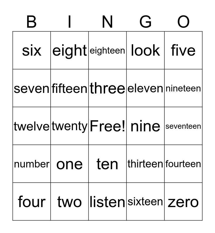 This bingo card has a free space and 24 words: one, two, three, four, five, six, seven, eight, nine, ten, eleven, twelve, thirteen, fourteen, fifteen, sixteen, seventeen, eighteen, nineteen, twenty, zero, number, look and listen.
