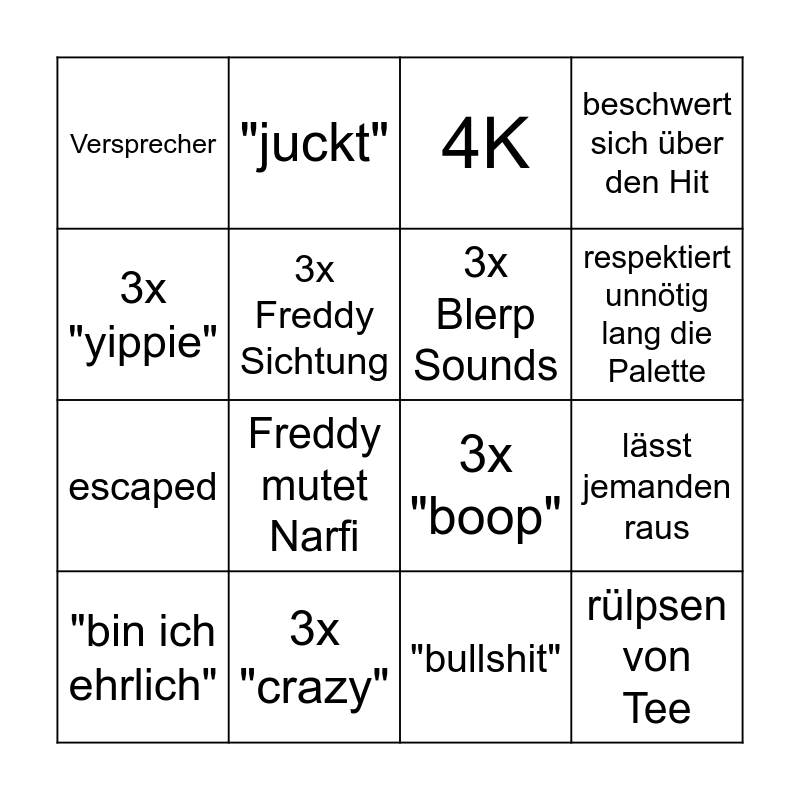 This bingo card has 16 words: 3x "crazy", lässt jemanden raus, 4K, Versprecher, escaped, "juckt", 3x "boop", "bullshit", 3x "yippie", 3x Freddy Sichtung, "bin ich ehrlich", beschwert sich über den Hit, Freddy mutet Narfi, respektiert unnötig lang die Palette, 3x Blerp Sounds and rülpsen von Tee.