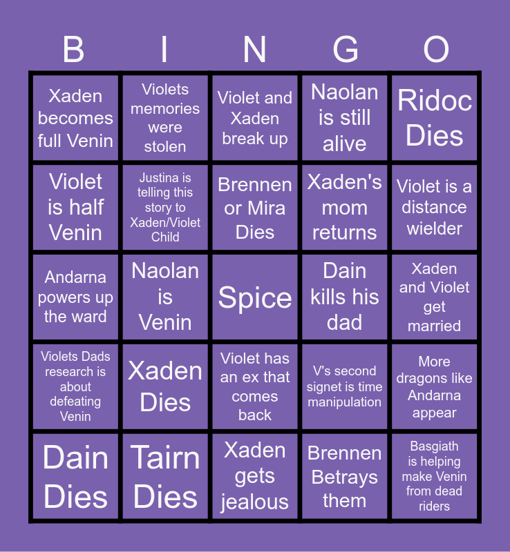 This bingo card has a free space and 24 words: Xaden Dies, Tairn Dies, Brennen or Mira Dies, Dain Dies, Ridoc Dies, Xaden becomes full Venin, Violet is half Venin, Violets memories were stolen, Dain kills his dad, Violet has an ex that comes back, Xaden's mom returns, Andarna powers up the ward, V's second signet is time manipulation, More dragons like Andarna appear, Justina is telling this story to Xaden/Violet Child, Brennen Betrays them, Xaden and Violet get married, Violet and Xaden break up, Violet is a distance wielder, Naolan is Venin, Basgiath is helping make Venin from dead riders, Violets Dads research is about defeating Venin, Naolan is still alive and Xaden gets jealous.