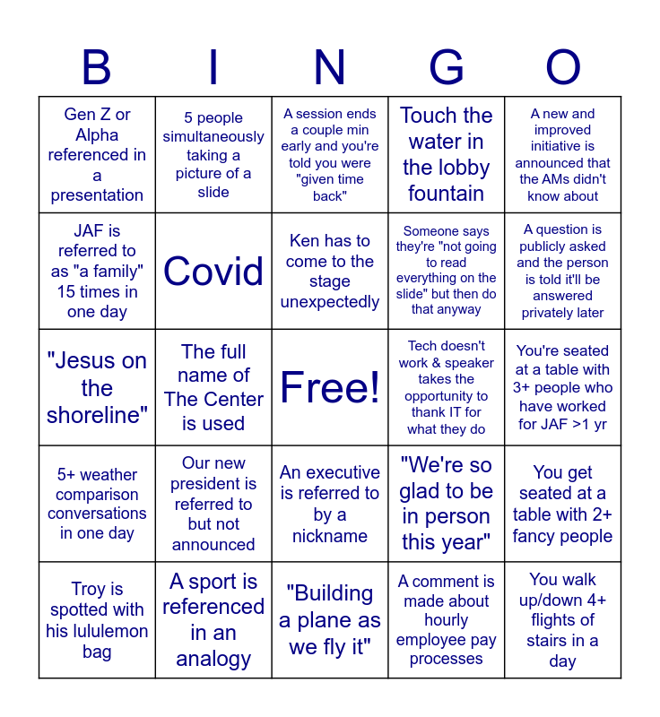 This bingo card has a free space and 24 words: Our new president is referred to but not announced, A sport is referenced in an analogy, Ken has to come to the stage unexpectedly, Troy is spotted with his lululemon bag, A new and improved initiative is announced that the AMs didn't know about, Gen Z or Alpha referenced in a presentation, JAF is referred to as "a family" 15 times in one day, 5 people simultaneously taking a picture of a slide, Tech doesn't work & speaker takes the opportunity to thank IT for what they do, An executive is referred to by a nickname, Someone says they're "not going to read everything on the slide" but then do that anyway, "Jesus on the shoreline", "We're so glad to be in person this year", You get seated at a table with 2+ fancy people, Covid, A comment is made about hourly employee pay processes, You're seated at a table with 3+ people who have worked for JAF >1 yr, A session ends a couple min early and you're told you were "given time back", A question is publicly asked and the person is told it'll be answered privately later, The full name of The Center is used, You walk up/down 4+ flights of stairs in a day, 5+ weather comparison conversations in one day, Touch the water in the lobby fountain and "Building a plane as we fly it".