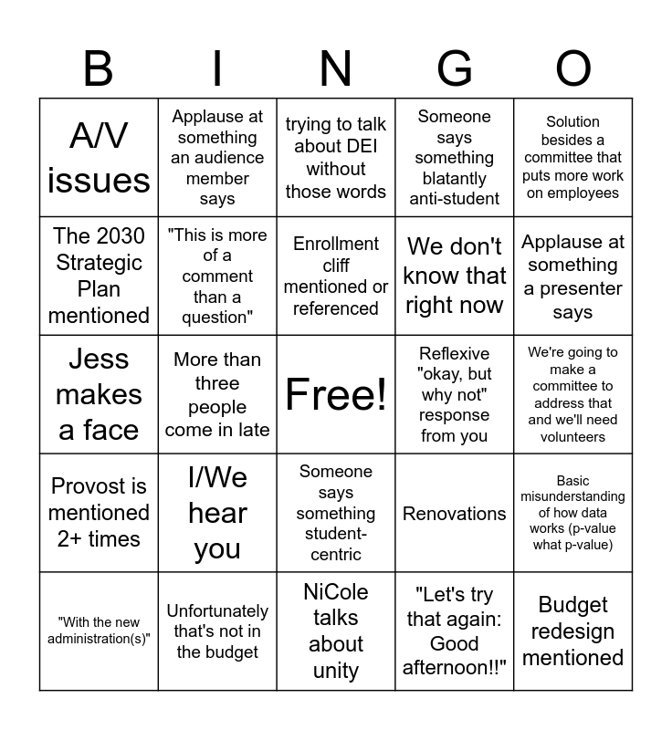 This bingo card has a free space and 24 words: I/We hear you, Unfortunately that's not in the budget, Enrollment cliff mentioned or referenced, "With the new administration(s)", Solution besides a committee that puts more work on employees, A/V issues, The 2030 Strategic Plan mentioned, Applause at something an audience member says, Reflexive "okay, but why not" response from you, Someone says something student-centric, We don't know that right now, Jess makes a face, Renovations, Basic misunderstanding of how data works (p-value what p-value), "This is more of a comment than a question", "Let's try that again: Good afternoon!!", We're going to make a committee to address that and we'll need volunteers, trying to talk about DEI without those words, Applause at something a presenter says, More than three people come in late, Budget redesign mentioned, Provost is mentioned 2+ times, Someone says something blatantly anti-student and NiCole talks about unity.