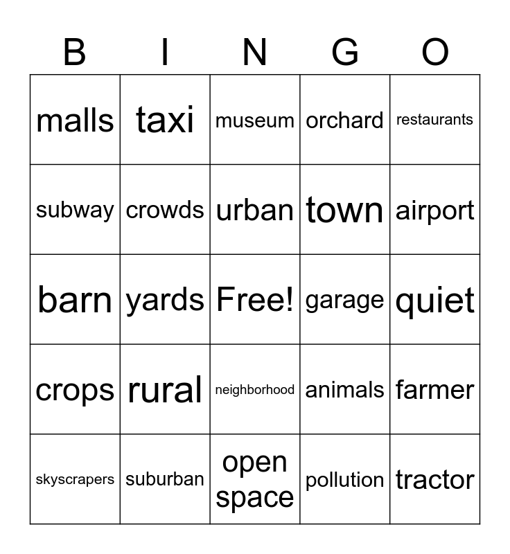 This bingo card has a free space and 24 words: rural, suburban, urban, skyscrapers, restaurants, malls, subway, taxi, garage, neighborhood, town, barn, animals, farmer, crowds, pollution, quiet, museum, airport, yards, tractor, crops, orchard and open space.