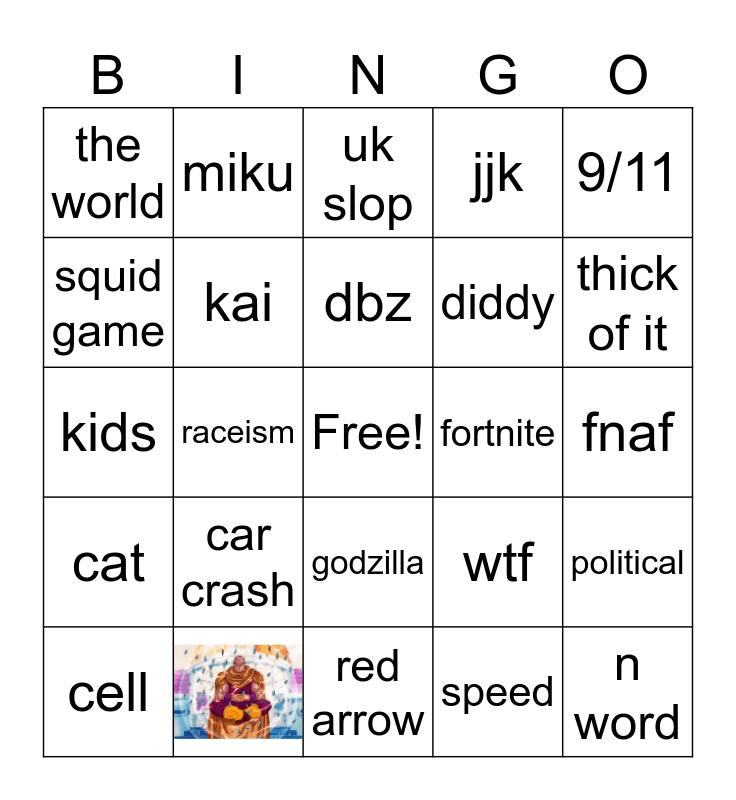 This bingo card has 1 images, a free space and 23 words: car crash, dbz, cell, 9/11, the world, squid game, miku, fortnite, godzilla, diddy, kids, wtf, political, kai, speed, fnaf, uk slop, thick of it, raceism, n word, cat, jjk and red arrow.