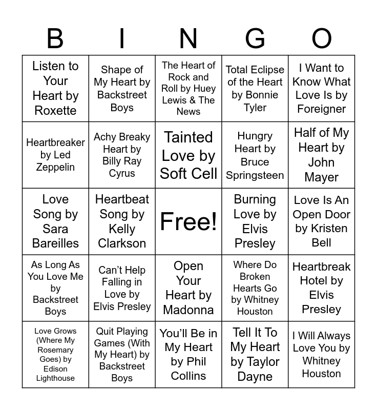 This bingo card has a free space and 50 words: My Heart Will Go On by Celine Dion, I Will Always Love You by Whitney Houston, Don’t Go Breaking My Heart by Elton John and Kiki Dee, You’ll Be in My Heart by Phil Collins, Can’t Help Falling in Love by Elvis Presley, All You Need is Love by The Beatles, Shape of My Heart by Backstreet Boys, Un-Break My Heart by Toni Braxton, Heartbreaker by Led Zeppelin, Can You Feel the Love Tonight by Elton John, Achy Breaky Heart by Billy Ray Cyrus, Total Eclipse of the Heart by Bonnie Tyler, Heartbreak Hotel by Elvis Presley, Where Do Broken Hearts Go by Whitney Houston, Me And My Broken Heart by Rixton, You Give Love a Bad Name by Bon Jovi, Tainted Love by Soft Cell, Burning Love by Elvis Presley, Love Shack by The B-52’s, I Want to Know What Love Is by Foreigner, Heartbeat Song by Kelly Clarkson, Tell It To My Heart by Taylor Dayne, Listen to Your Heart by Roxette, Hungry Heart by Bruce Springsteen, Stereo Hearts by Gym Class Heroes, I’d Do Anything For Love (But I Won’t Do That) by Meat Loaf, Half of My Heart by John Mayer, Heart of Gold by Johnny Cash, The Heart of Rock and Roll by Huey Lewis & The News, Open Your Heart by Madonna, Heart-Shaped Box by Nirvana, Your Cheatin’ Heart by Hank Williams, Deep In The Heart of Texas by Moe Bandy, Heart of Stone by Cher, Quit Playing Games (With My Heart) by Backstreet Boys, Heartbreaker by Pat Benatar, Heart of Glass by Blondie, I Cross My Heart by George Strait, Love Story by Taylor Swift, Love Is An Open Door by Kristen Bell, Burning Heart by Survivor, L-O-V-E by Nat King Cole, Bleeding Love by Leona Lewis, The Power of Love by Huey Lewis & The News, Love Grows (Where My Rosemary Goes) by Edison Lighthouse, Love Song by Sara Bareilles, I Like It I Love It by Tim McGraw, What Is Love by Haddaway, As Long As You Love Me by Backstreet Boys and Stop! In The Name of Love by The Supremes.