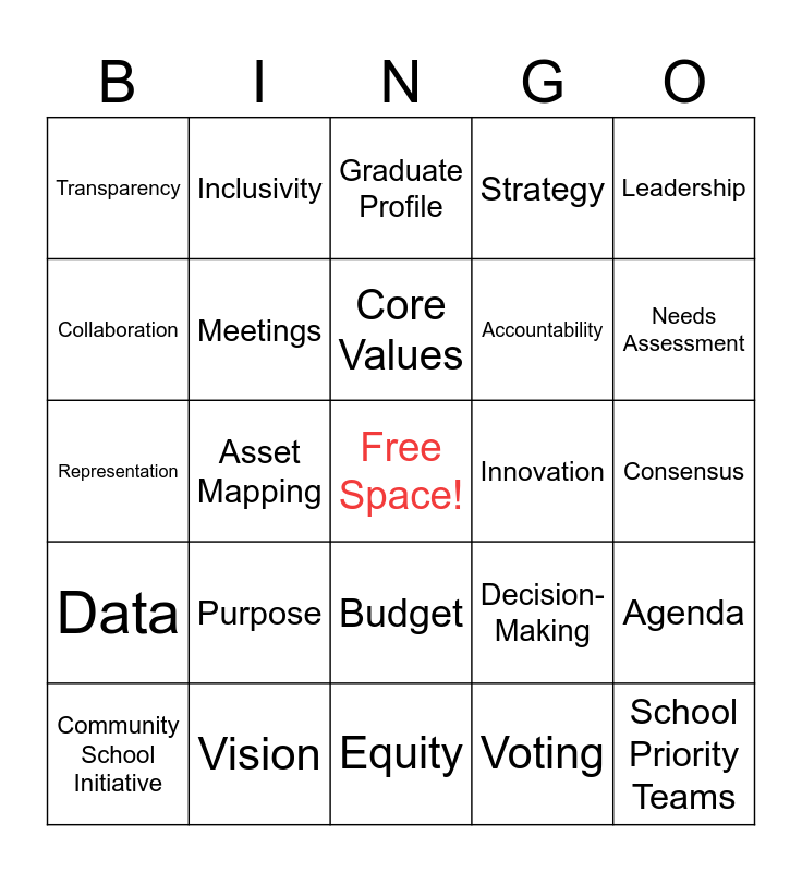 This bingo card has a free space and 24 words: Purpose, Vision, Core Values, Community School Initiative, Leadership, Transparency, Collaboration, Inclusivity, Innovation, Budget, Accountability, Representation, Decision-Making, Agenda, Meetings, Voting, Consensus, Graduate Profile, Needs Assessment, Asset Mapping, School Priority Teams, Data, Strategy and Equity.