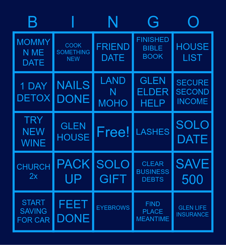This bingo card has a free space and 24 words: START SAVING FOR CAR, PACK UP, LAND N MOHO, FIND PLACE MEANTIME, HOUSE LIST, MOMMY N ME DATE, COOK SOMETHING NEW, FRIEND DATE, LASHES, SOLO DATE, TRY NEW WINE, NAILS DONE, CLEAR BUSINESS DEBTS, SAVE 500, 1 DAY DETOX, FEET DONE, EYEBROWS, FINISHED BIBLE BOOK, SECURE SECOND INCOME, CHURCH 2x, GLEN HOUSE, SOLO GIFT, GLEN ELDER HELP and GLEN LIFE INSURANCE.