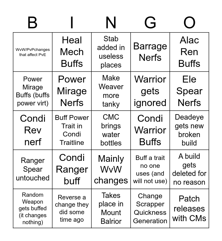 This bingo card has a free space and 24 words: Condi Ranger buff, Reverse a change they did some time ago, Make Weaver more tanky, Random Weapon gets buffed (it changes nothing), Alac Ren Buffs, WvW/PvPchanges that affect PvE, Power Mirage Buffs (buffs power virt), Heal Mech Buffs, Condi Warrior Buffs, Mainly WvW changes, Warrior gets ignored, Condi Rev nerf, Buff a trait no one uses (and will not use), A build gets deleted for no reason, Power Mirage Nerfs, Change Scrapper Quickness Generation, Deadeye gets new broken build, Stab added in useless places, Ele Spear Nerfs, Buff Power Trait in Condi Traitline, Patch releases with CMs, Ranger Spear untouched, Barrage Nerfs and Takes place in Mount Balrior.