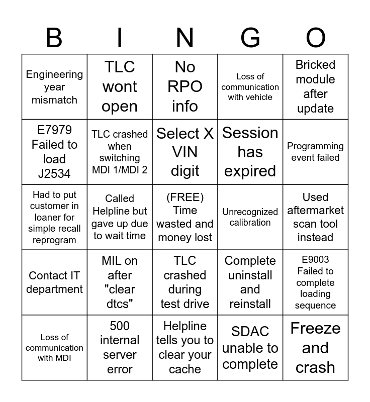 This bingo card has a free space and 24 words: Loss of communication with MDI, MIL on after "clear dtcs", Select X VIN digit, SDAC unable to complete, Bricked module after update, Engineering year mismatch, TLC wont open, No RPO info, Unrecognized calibration, Used aftermarket scan tool instead, Had to put customer in loaner for simple recall reprogram, TLC crashed when switching MDI 1/MDI 2, Complete uninstall and reinstall, E9003 Failed to complete loading sequence, E7979 Failed to load J2534, 500 internal server error, Helpline tells you to clear your cache, Loss of communication with vehicle, Programming event failed, Contact IT department, Called Helpline but gave up due to wait time, TLC crashed during test drive, Session has expired and Freeze and crash.