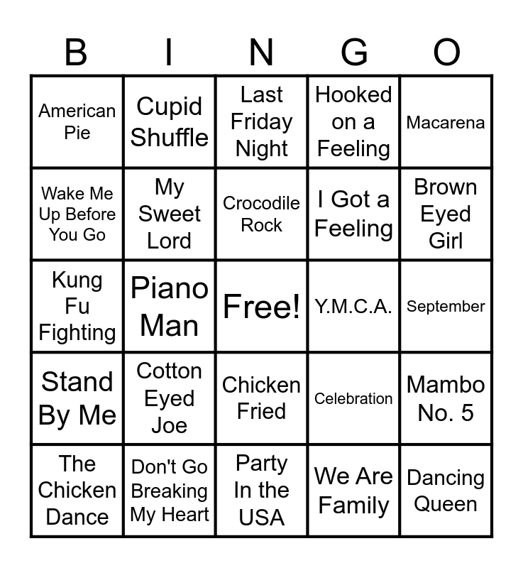 This bingo card has a free space and 31 words: Party In the USA, Sweet Caroline, Piano Man, Build Me Up Buttercup, American Pie, Last Friday Night, My Sweet Lord, Celebration, Y.M.C.A., We Are Family, September, Dancing Queen, Cha Cha Slide, Man! I feel like a woman, Brown Eyed Girl, Come On Eileen, Mambo No. 5, Cotton Eyed Joe, Stand By Me, Chicken Fried, Macarena, Old Time Rock & Roll, The Chicken Dance, Cupid Shuffle, I Got a Feeling, Wake Me Up Before You Go, Hooked on a Feeling, Kung Fu Fighting, Don't Go Breaking My Heart, Crocodile Rock and Escape (Pina Colada Song).