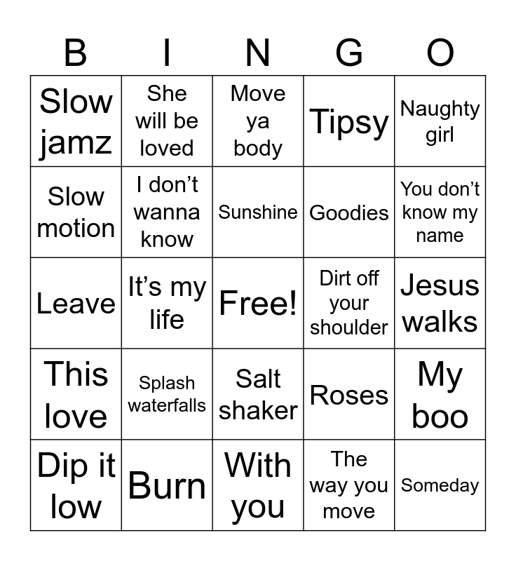 This bingo card has a free space and 59 words: Yeah, Burn, If I ain’t got you, This love, The way you move, The reason, I don’t wanna know, Hey ya!, Goodies, Lean back, Tipsy, Confessions part two, Slow motion, Freek-A-Leek, Here without you, Slow jamz, Someday, Naughty girl, My immortal, Sunshine, Dirt off your shoulder, Move ya body, Dip it low, My boo, One Call away, Me myself and I, Turn me on, The first cut is the deepest, You don’t know my name, My place, Overnight celebrity, Hotel, Numb, Diary, She will be loved, White flag, Heaven, It’s my life, Pieces of me, Leave, Milkshake, Splash waterfalls, Jesus walks, Locked up, Stand up, Suga, suga, All falls down, Toxic, Salt shaker, With you, Meant to live, I like that, Sorry, 2004, My happy ending, On fire, Roses, Walk outta heaven, Lose my breath and My band.