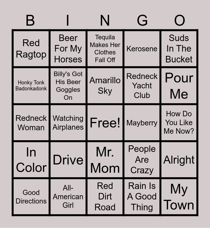 This bingo card has a free space and 43 words: I Go Back, My Town, Brokenheartsville, Good Directions, Some Beach, Rain Is A Good Thing, Tequila Makes Her Clothes Fall Off, Mississippi Girl, Suds In The Bucket, All-American Girl, Kerosene, Mayberry, Mr. Mom, Drive, Ol' Red, Red Dirt Road, It's Five O'Clock Somewhere, Redneck Woman, Chicks Dig It, Pour Me, Beer For My Horses, Save A Horse (Ride a Cowboy), Alcohol, Red Ragtop, Just To See You Smile, How Do You Like Me Now?, Lover, Lover, Toes, People Are Crazy, In Color, I Run To You, Alright, Troubadour, Watching Airplanes, A Different World, Gunpowder and Lead, These Are My People, Amarillo Sky, Honky Tonk Badonkadonk, Redneck Yacht Club, Baby Girl, Billy's Got His Beer Goggles On and That's What I Love About Sunday.