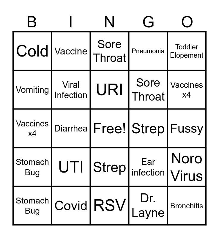 This bingo card has a free space and 45 words: Flu, Covid, RSV, Ear infection, Noro Virus, Stomach Bug, Viral Infection, URI, Pneumonia, Bronchitis, Cold, UTI, Strep, Fussy, Reflux, Vomiting, Diarrhea, Sore Throat, Ear Lavage, Vaccines x4, Vaccine, Dr. Steele, Dr. Layne, Toddler Elopement, Flu, Covid, RSV, Ear infection, Noro Virus, Stomach Bug, Viral Infection, URI, Pneumonia, Bronchitis, Cold, UTI, Strep, Fussy, Reflux, Vomiting, Diarrhea, Sore Throat, Ear Lavage, Vaccines x4 and Vaccine.