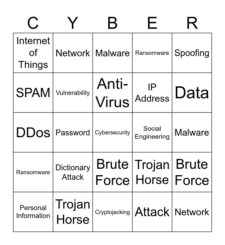 This bingo card has a free space and 43 words: Data, Network, Device, Personal Information, Internet of Things, Attack, Malware, Phishing, Spoofing, Trojan Horse, Ransomware, Social Engineering, Brute Force, Dictionary Attack, Password, Cryptojacking, Drive-by Downloads, DDos, Password, Data, Network, Device, Personal Information, Internet of Things, Attack, Malware, Phishing, Spoofing, Trojan Horse, Ransomware, Social Engineering, Brute Force, Dictionary Attack, Password, Cryptojacking, Drive-by Downloads, DDos, Anti-Virus, SPAM, IP Address, e-mail, Vulnerability and Hacker.