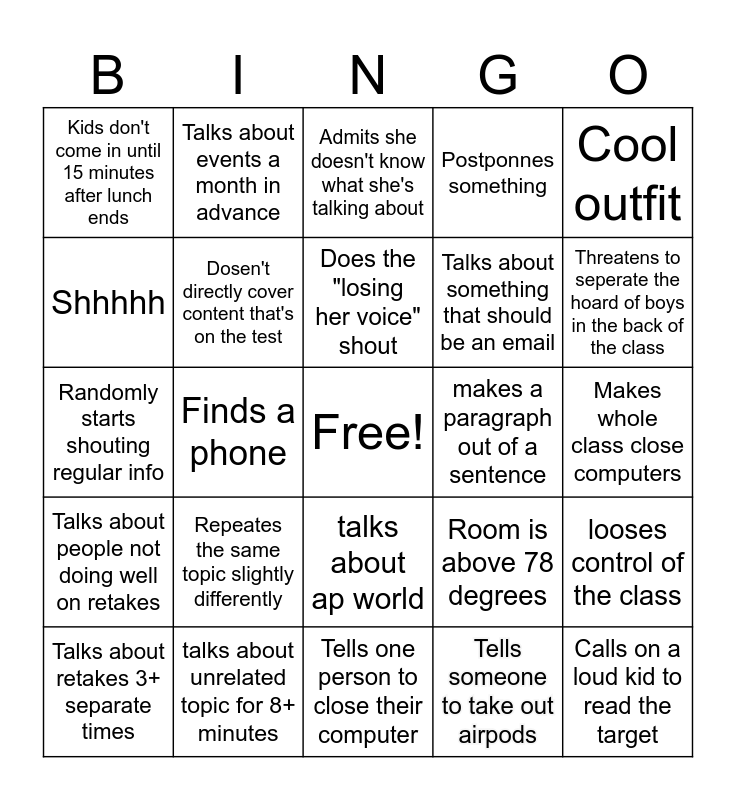 This bingo card has a free space and 24 words: Repeates the same topic slightly differently, talks about unrelated topic for 8+ minutes, Does the "losing her voice" shout, Talks about retakes 3+ separate times, Cool outfit, Kids don't come in until 15 minutes after lunch ends, Shhhhh, Talks about events a month in advance, makes a paragraph out of a sentence, talks about ap world, Talks about something that should be an email, Randomly starts shouting regular info, Room is above 78 degrees, looses control of the class, Dosen't directly cover content that's on the test, Tells someone to take out airpods, Makes whole class close computers, Admits she doesn't know what she's talking about, Threatens to seperate the hoard of boys in the back of the class, Finds a phone, Calls on a loud kid to read the target, Talks about people not doing well on retakes, Postponnes something and Tells one person to close their computer.