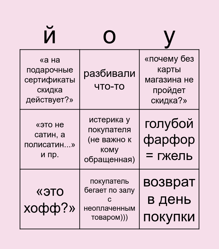 This bingo card has a free space and 8 words: голубой фарфор = гжель, «почему без карты магазина не пройдет скидка?», разбивали что-то, «это хофф?», «а на подарочные сертификаты скидка действует?», возврат в день покупки, «это не сатин, а полисатин...» и пр. and покупатель бегает по залу с неоплаченным товаром))).