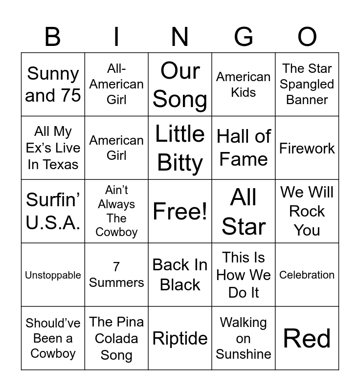 This bingo card has a free space and 74 words: The Way I Talk, God’s Country, Our Song, Brand New Man, Fishin’ in the Dark, Chicken Fried, Wagon Wheel, Cruise, Should’ve Been a Cowboy, Dirt Road Anthem, Forever and Ever, Amen, Cowboy Take Me Away, Little Bitty, All My Ex’s Live In Texas, Rhinestone Cowboy, Ain’t Always The Cowboy, Only In America, Firework, Born in the U.S.A., Surfin’ U.S.A., American Girl, All-American Girl, American Kids, R.O.C.K. In The U.S.A., Red, Courtesy Of The Red, White, and Blue, Party in the U.S.A., American Soldier, God Bless The U.S.A., American Pie, The Star Spangled Banner, California Gurls, Beachin’, Soak Up The Sun, Some Beach, Walking on Sunshine, No Shoes, No Shirt, No Problem, Kokomo, Sunroof, Knee Deep, Riptide, The Pina Colada Song, Malibu, Cruel Summer, Margaritaville, Sunny and 75, Somewhere on a Beach, 7 Summers, Summer Nights, Heat Waves, My House, All I Do Is Win, We Will Rock You, The Champion, Danger Zone, All The Way Up, Back In Black, Black and Yellow, We Are Family, Celebration, Hall of Fame, We Are The Champions, Unstoppable, Can’t Hold Us, All Star, On Top Of The World, Let’s Go, The Final Countdown, This Is How We Do It, Heart of a Champion, Stronger, Yeah!, GDFR and Don’t Stop Believin’.