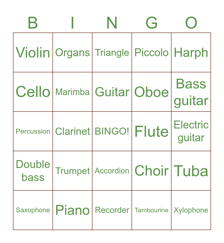 This bingo card has a free space and 24 words: Trumpet, Piano, Guitar, Saxophone, Harph, Violin, Cello, Organs, Flute, Accordion, Oboe, Percussion, Choir, Tuba, Marimba, Tambourine, Electric guitar, Triangle, Bass guitar, Clarinet, Xylophone, Double bass, Piccolo and Recorder.