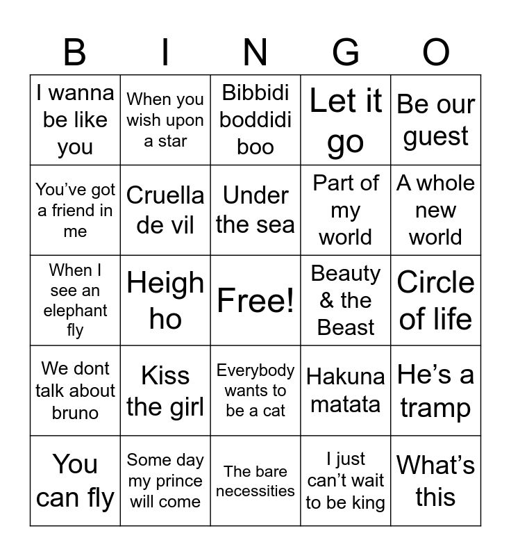 This bingo card has a free space and 24 words: Kiss the girl, Some day my prince will come, Under the sea, You can fly, Be our guest, I wanna be like you, You’ve got a friend in me, When you wish upon a star, Beauty & the Beast, Everybody wants to be a cat, Part of my world, When I see an elephant fly, Hakuna matata, He’s a tramp, Cruella de vil, I just can’t wait to be king, Circle of life, Bibbidi boddidi boo, A whole new world, Heigh ho, What’s this, We dont talk about bruno, Let it go and The bare necessities.