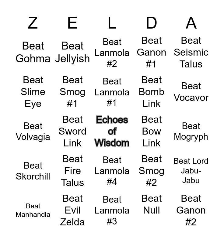 This bingo card has a free space and 24 words: Beat Manhandla, Beat Fire Talus, Beat Lanmola #1, Beat Null, Beat Seismic Talus, Beat Gohma, Beat Jellyish, Beat Lanmola #2, Beat Bow Link, Beat Mogryph, Beat Volvagia, Beat Smog #1, Beat Smog #2, Beat Lord Jabu-Jabu, Beat Slime Eye, Beat Evil Zelda, Beat Lanmola #3, Beat Ganon #1, Beat Vocavor, Beat Skorchill, Beat Sword Link, Beat Lanmola #4, Beat Bomb Link and Beat Ganon #2.