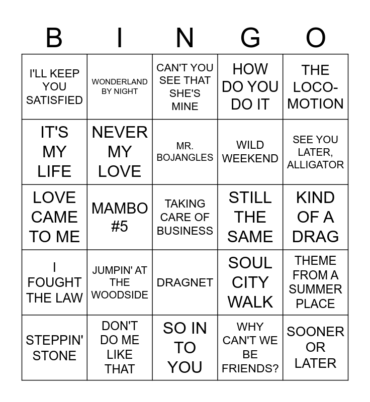 This bingo card has 80 words: ALL I REALLY WANT TO DO, BEND ME, SHAPE ME, CAN'T YOU SEE THAT SHE'S MINE, COUNT ME IN, DOWN ON THE CORNER, GOOD THING, GOOD VIBRATIONS, GREEN EYES, THE GUITAR MAN, HI-DE-HO THAT OLD SWEET ROLL, HONKY TONK PART 1, HOW CAN YOU MEND A BROKEN HEART, HOW DO YOU DO IT, I'LL KEEP YOU SATISFIED, INDIAN GIVER, IT'S MY LIFE, JUKE BOX SATURDAY NIGHT, JUMPIN' AT THE WOODSIDE, JUST A LITTLE, KIND OF A DRAG, LET'S GROOVE TONIGHT, THE LOCO-MOTION, LOVE CAME TO ME, MR. BOJANGLES, NEVER MY LOVE, NIGHTS IN WHITE SATIN, RAMBLIN' MAN, RIDERS IN THE STORM, SAIL ALONG SILVERY MOON, SATURDAY IN THE PARK, SEE YOU LATER, ALLIGATOR, SISTER GOLDEN HAIR, SO IN TO YOU, SOONER OR LATER, STEPPIN' STONE, STILL THE SAME, STOMPIN' AT THE SAVOY, STOP, STOP, STOP, TAKE A CHANCE ON ME, TAKING CARE OF BUSINESS, TEQUILA SUNRISE, THAT'S THE WAY (I LIKE IT), THERE'S A KIND OF HUSH, THESE EYES, TIME IS TIGHT, WONDERLAND BY NIGHT, YOU CAN'T DO THAT, YOUNG GIRL, ZORBA THE GREEK, BAND ON THE RUN, THEME FROM A SUMMER PLACE, MAMBO #5, SOUL CITY WALK, EVERY BREATH YOU TAKE, KISS, LET ME LOVE YOU TONIGHT, BOHEMIAN RHAPSODY, LONELY TOO LONG, (HEY BABY) GO ALL THE WAY, DRAGNET, WILD WEEKEND, TELL ME, EVIL WAYS, SOME DAY WE'RE GONNA LOVE AGAIN, FOOL ON A HILL, SHE'S ABOUT A MOVER, EVERYDAY PEOPLE, BARNEY GOOGLE, BEYOND THE BLUE HORIZON, ABRACADABRA, I FOUGHT THE LAW, DON'T DO ME LIKE THAT, POLKA DOTS AND MOONBEAMS, HANKY PANKY, SHE'S MY GIRL, WALK, DON'T RUN, WHY CAN'T WE BE FRIENDS?, I CAN SEE FOR MILES, I'M A MAN and TIME OF THE SEASON.