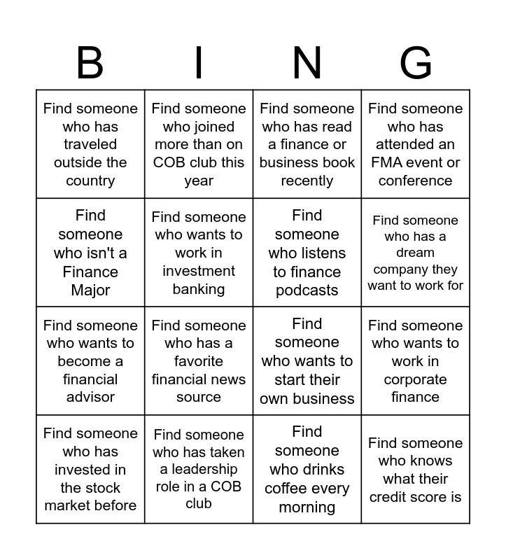 This bingo card has 16 words: Find someone who has taken a leadership role in a COB club, Find someone who wants to work in corporate finance, Find someone who has read a finance or business book recently, Find someone who has traveled outside the country, Find someone who wants to become a financial advisor, Find someone who joined more than on COB club this year, Find someone who wants to start their own business, Find someone who drinks coffee every morning, Find someone who isn't a Finance Major, Find someone who wants to work in investment banking, Find someone who has invested in the stock market before, Find someone who has attended an FMA event or conference, Find someone who has a favorite financial news source, Find someone who has a dream company they want to work for, Find someone who listens to finance podcasts and Find someone who knows what their credit score is.