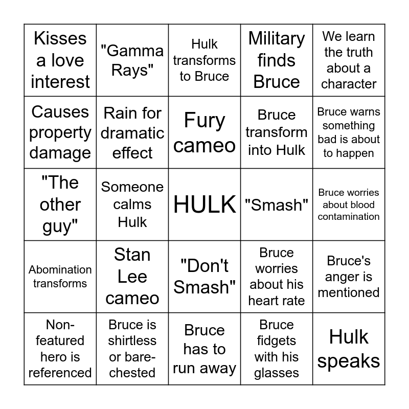 This bingo card has a free space and 24 words: Stan Lee cameo, Bruce is shirtless or bare-chested, Fury cameo, Non-featured hero is referenced, We learn the truth about a character, Kisses a love interest, Causes property damage, "Gamma Rays", "Smash", "Don't Smash", Bruce transform into Hulk, "The other guy", Bruce worries about his heart rate, Bruce's anger is mentioned, Rain for dramatic effect, Bruce fidgets with his glasses, Bruce worries about blood contamination, Hulk transforms to Bruce, Bruce warns something bad is about to happen, Someone calms Hulk, Hulk speaks, Abomination transforms, Military finds Bruce and Bruce has to run away.