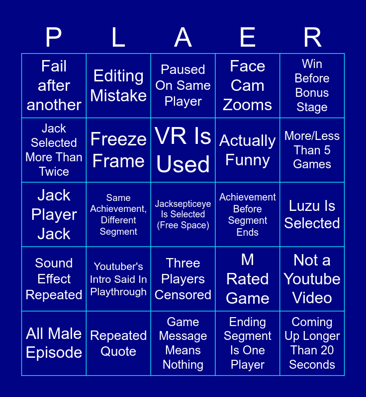 This bingo card has a free space and 26 words: Three Players Censored, Ending Segment Is One Player, VR Is Used, Repeated Quote, Win Before Bonus Stage, Fail after another, Jack Selected More Than Twice, Editing Mistake, Luzu Is Selected, M Rated Game, Actually Funny, Jack Player Jack, Not a Youtube Video, All Male Episode, Same Achievement, Different Segment, Nothing Burger, Face Cam Zooms, Sound Effect Repeated, Paused On Same Player, Coming Up Longer Than 20 Seconds, More/Less Than 5 Games, Game Message Means Nothing, Achievement Before Segment Ends, Youtuber's Intro Said In Playthrough, Freeze Frame and Non Swear Word Censored.