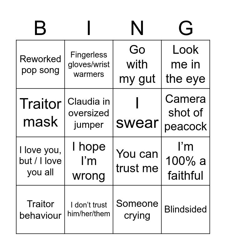 This bingo card has 26 words: Welsh accent, Name spelled incorrectly on slate, Camera shot of peacock, Claudia in something khaki coloured, Traitor mask, Reworked pop song, Claudia in oversized jumper, Fingerless gloves/wrist warmers, Someone crying, 100%, I love you, but / I love you all, You can trust me, Yourself, I know that I’m a faithful, I’m 100% a faithful, Weird, Look me in the eye, Blindsided, Go with my gut, Traitor behaviour, I hope I’m wrong, Throw under bus, I don’t trust him/her/them, Sisterhood, I swear and the greatest experience.