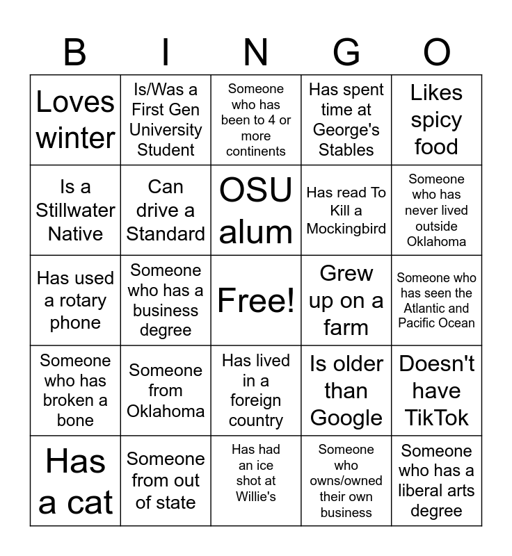 This bingo card has a free space and 24 words: Someone from Oklahoma, Someone from out of state, OSU alum, Has a cat, Likes spicy food, Loves winter, Is a Stillwater Native, Is/Was a First Gen University Student, Grew up on a farm, Has lived in a foreign country, Has read To Kill a Mockingbird, Has used a rotary phone, Is older than Google, Doesn't have TikTok, Can drive a Standard, Someone who owns/owned their own business, Someone who has seen the Atlantic and Pacific Ocean, Someone who has been to 4 or more continents, Someone who has never lived outside Oklahoma, Someone who has a business degree, Someone who has a liberal arts degree, Someone who has broken a bone, Has spent time at George's Stables and Has had an ice shot at Willie's.