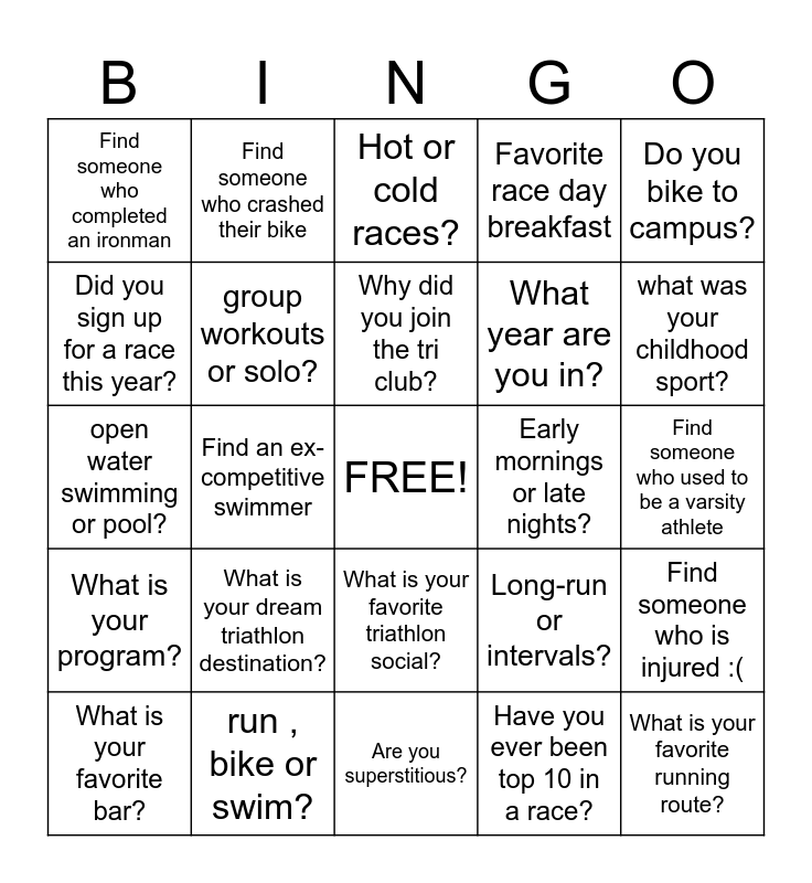 This bingo card has a free space and 24 words: What is your dream triathlon destination?, run , bike or swim?, Why did you join the tri club?, What is your favorite bar?, Do you bike to campus?, Find someone who completed an ironman, Did you sign up for a race this year?, Find someone who crashed their bike, Early mornings or late nights?, What is your favorite triathlon social?, What year are you in?, open water swimming or pool?, Long-run or intervals?, Find someone who is injured :(, group workouts or solo?, Have you ever been top 10 in a race?, Find someone who used to be a varsity athlete, Hot or cold races?, what was your childhood sport?, Find an ex-competitive swimmer, What is your favorite running route?, What is your program?, Favorite race day breakfast and Are you superstitious?.